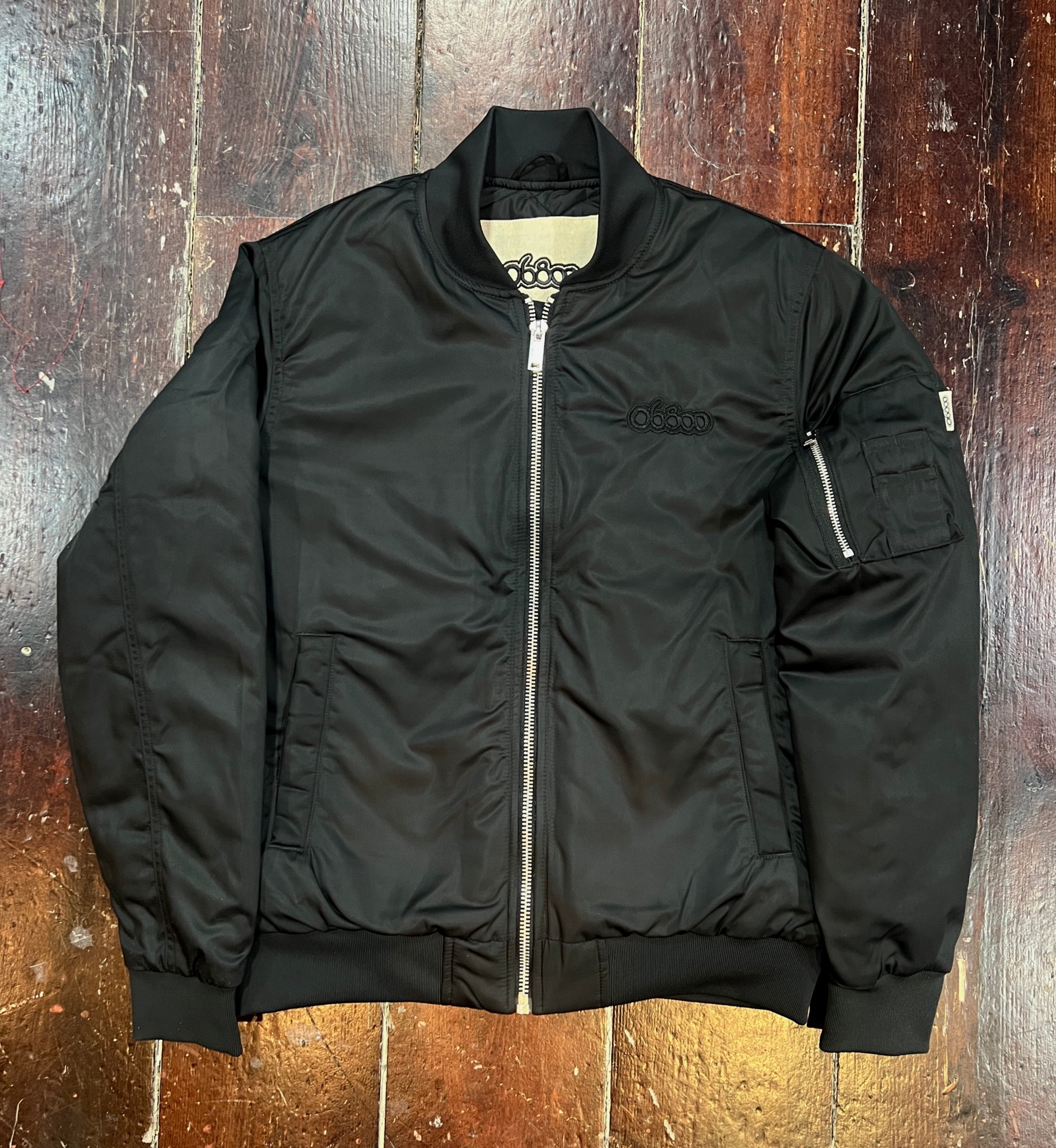 BOMBER NEGRA MEDIUM FIT con 06800 bordado en negro exterior lado izquierdo, etiqueta pequeña bolsillo y etiqueta interna bordada.